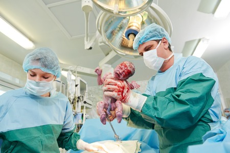 surgeons perfoming surgery operation of abdominal cesarean section during child delivery birth at clinic operating room