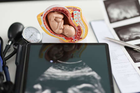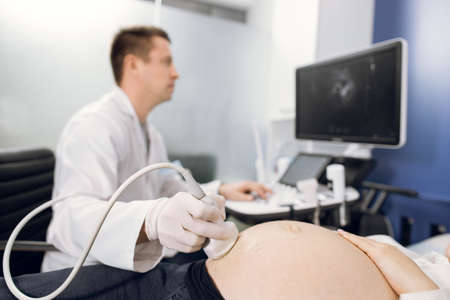 Close-up shot of male doctor performing Ultrasound Sonogram procedure to unrecognizable pregnant woman. Focus on the ultrasound transducer on the belly of the future mother.