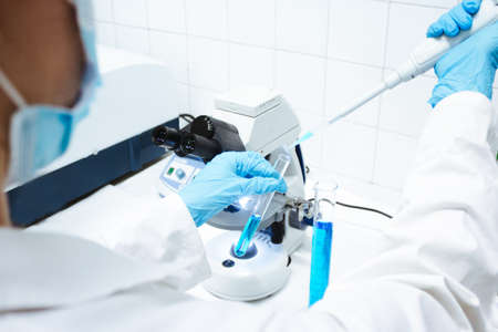 Hands of a scientist in the laboratory with a test tube and a microscope. The invention of the vaccine, a doctor in the clinic of artificial insemination IVF. Tests, fertilization of the egg