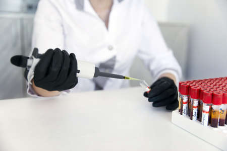 Stock photo of unrecognized scientist filling test tubes in the laboratory.