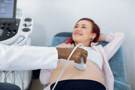 Cropped close up of a belly of happy cheerful pregnant woman having ultrasound scanning at the medical clinic. Female doctor making ultrasonic diagnostics. Focus on ultrasound transducer