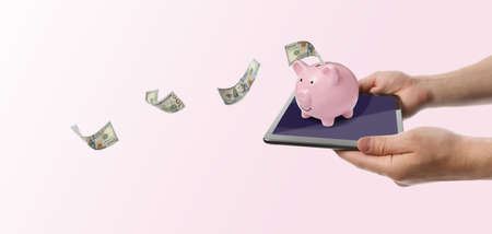 Man holding tablet with piggy bank and flying dollar banknotes on pink background, banner design. online banking