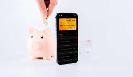 mobile banking. Smartphone with internet online bank application. Piggy bank with debit card on white background. Save money business concept