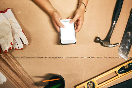 Unrecognizable worker with hands in white plaster hold mobile phone with empty screen, pov. Background of stucco wall with free space.