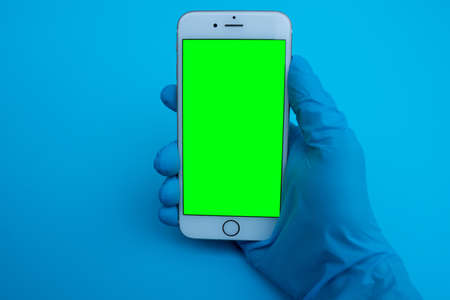 A male hand in white gloves holds a smartphone with a white screen. Mock up. Blue background. Copy space. Business and advertising concepts.