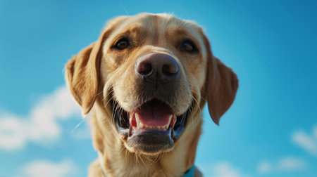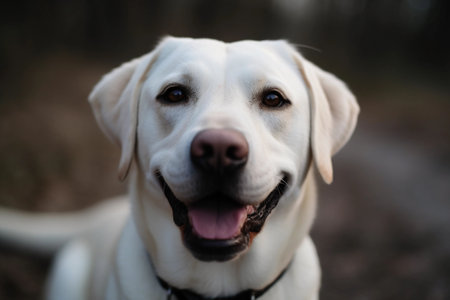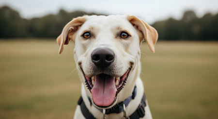 A heartwarming close-up portrait of a happy yellow Labrador retriever looking directly at the camera with a joyful smile. The friendly dog's mouth is open, and its cheerful expression is captured against a blurred outdoor background, representing companionship and pet happiness.
