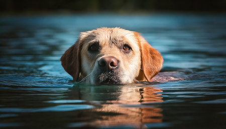 Labrador with wooden stick swimming. Beige dog playing fetch in lake water. Generate ai