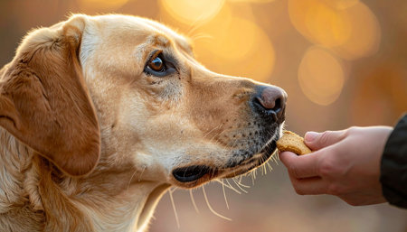 In the warm, golden light of a setting sun, a gentle golden retriever receives a well-deserved treat from its owners hand. This close-up moment captures the deep bond of trust, love, and companionship shared between a human and their loyal canine friend, a perfect illustration of positive reinforcement and care.