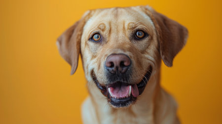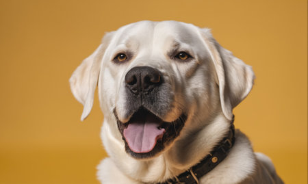 A white labrador retriever smiles at the camera, with its tongue out, in front of a yellow background