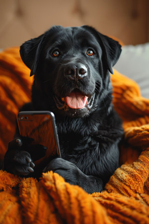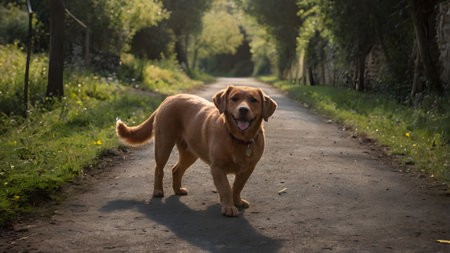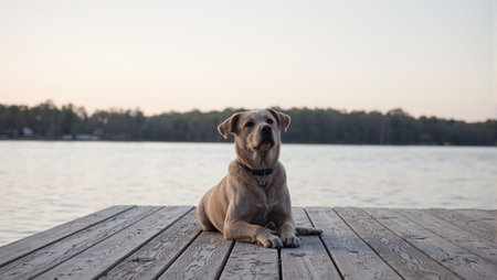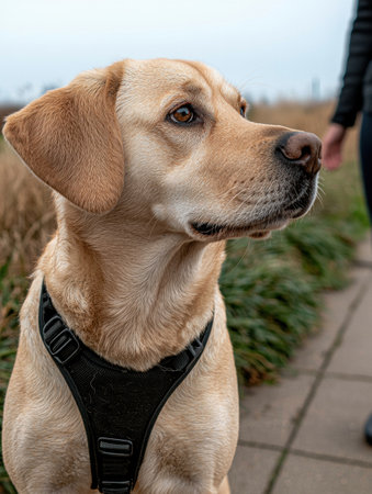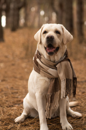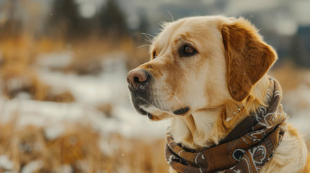 This captivating image features a Labrador dog wearing a scarf, exuding charm. Set against a beautiful nature backdrop, the photo conveys warmth and companionship.