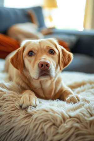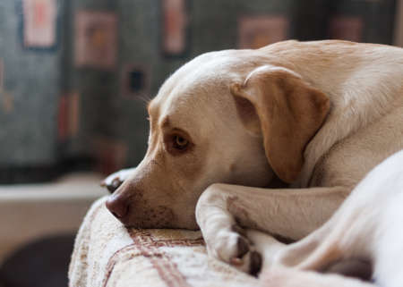 portrait of a large dog of breed Labrador of light coat of color, lies on a sofa in the apartment, pets