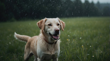 A heartbreaking close-up of a sad, wet Labrador Retriever lying in a puddle during a downpour. Its soulful eyes gaze at the camera, reflecting the somber mood.