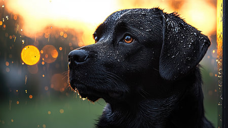 A close-up portrait of a wet black Labrador Retriever in the rain, with water droplets glistening on its fur. The background features a beautiful bokeh effect from the golden hour sunlight.