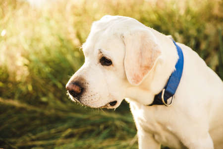Close-up of a dog puppy labrador head outdoors in nature performs a command to sit and smiles, sticking out his tongue.