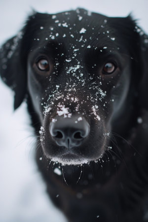 Close Up of Black Dog in Snow, A Stunning Winter Portrait of a Loyal Pet