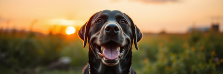 Black Labrador Retriever dog in the city at sunset. Selective focus.