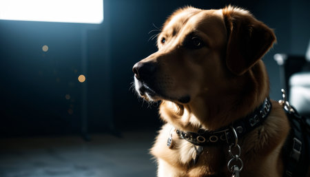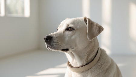 AI Generated. Dog with a collar sitting indoors in a bright room while looking calmly to the side