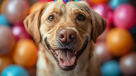 Portrait of a cute dog in a birthday hat on a blurred background.