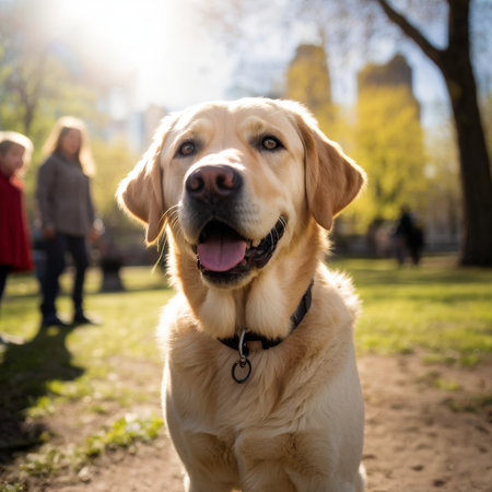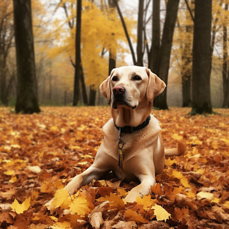 portrait of cute labrador retriever sitting among the autumn leaves in the park walking dog generative ai