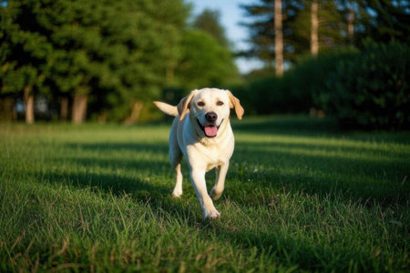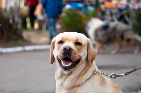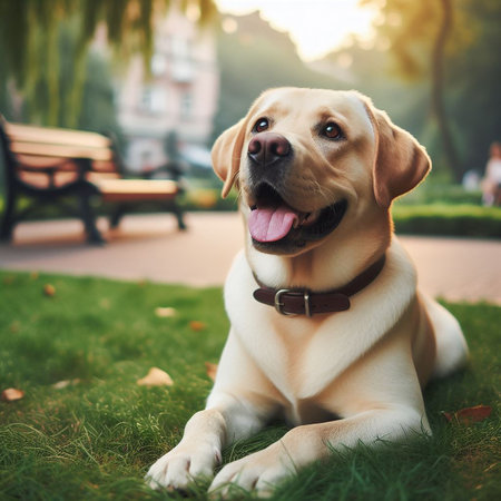Portrait of an adult Labrador on a background of green Park. A happy dog is delighted with a trip to nature.