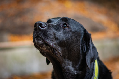 Beautiful black labrador retriever looking forward during autumn, dog has green collar