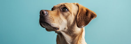 Poortrait labrador retriever dog looking up with sad eyes. Isolated on blue pastel background