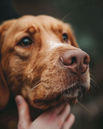 Close up of brown dog with persons hand on head, showing affection and love towards the loyal pet