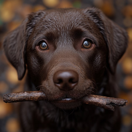 A cheerful brown dog holds a sturdy stick in its mouth while surrounded by falling leaves.