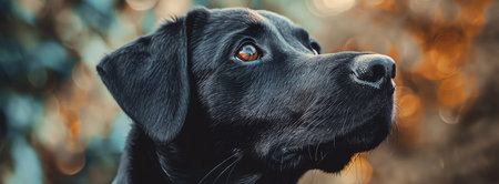 A beautiful black dog sits attentively in warm autumn sunlight, showcasing its gleaming coat and thoughtful expression, embodying loyalty and companionship.