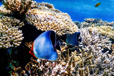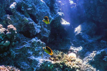 Underwater colorful tropical fishes at coral reef at Red Sea. Blue water in Ras Muhammad National Park in Sinai, Egypt