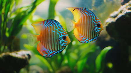 Two vibrant tropical fish navigate through a clean aquarium filled with lush plants, creating a lively underwater environment.