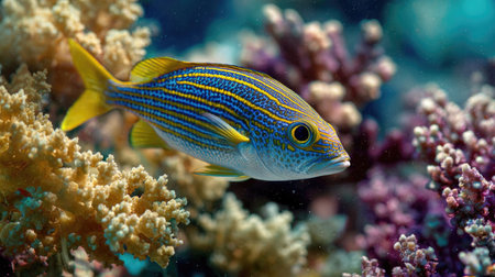 A vibrant fish with yellow fins and blue stripes swims amidst colorful coral formations. The underwater scene features various textures and shades of blue, yellow, and purple. The composition is well-lit, suggesting a bright environment suitable for various commercial and editorial applications.