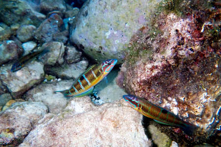 Thallasoma Pavo - Female Ornate wrasse fishes in swimming motion under the sea at Mediterranean
