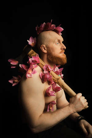 Portrait of militant man with red beard in flowers. Handsome strong man holds ax, in peaceful mood, orchids grow on man