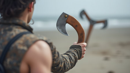 A warrior on a sandy beach prepares for battle. He holds custom-made throwing axes and emanates strength, skill, and determination.