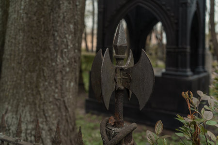 Old iron ax in the cemetery. Shallow depth of field.