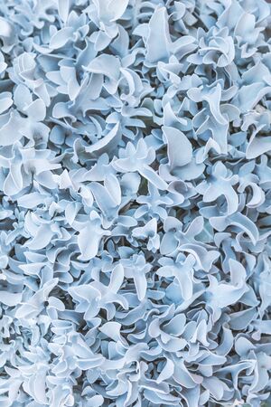 Full frame natural background texture of velvet silver foliage of silverdust dusty miller plant monochromatic. Beautiful carved leaves