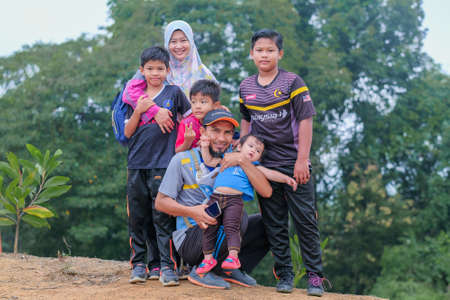 Muadzam Shah, Malaysia - September 13th, 2020 : Hiking family having food at a top of Ridan Hill in Muadzam Shah, Malaysia. Family hiking on vacation.