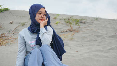 Portrait of Asian teenage muslim girl listeing to music on phone, sitting on the beach