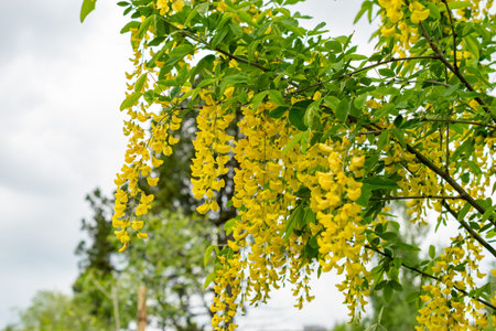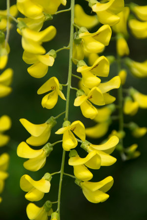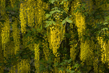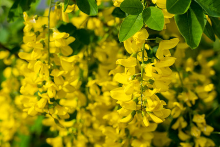 Laburnum anagyroides golden rain chain ornamental shrub branches in bloom, flowering small tree with bright beautiful yellow flowers and green leaves