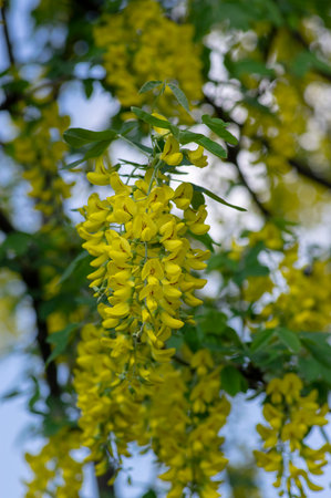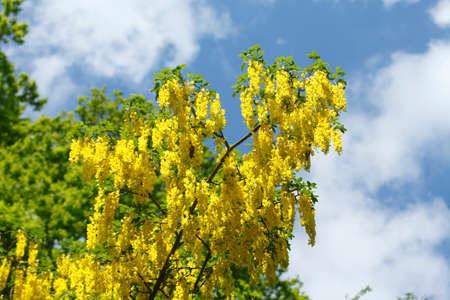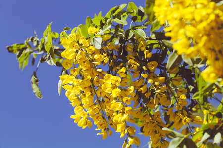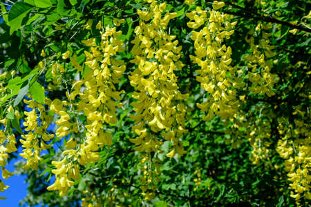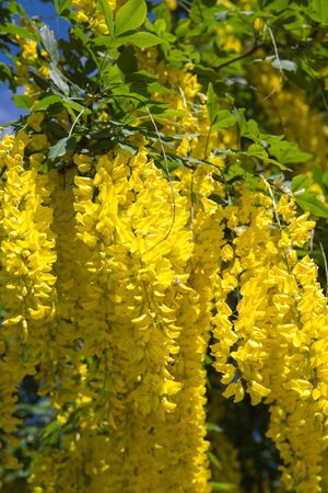 Laburnum anagyroides ornamental shrub branches in bloom against blue sky, flowering small tree with bright yellow flowers