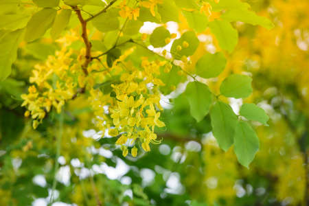 Beautiful Cassia fistula (Golden shower tree) blossom blooming on the tree with nature blurred background, known as golden rain tree, canafistula, and ratchapruek in Thailand.