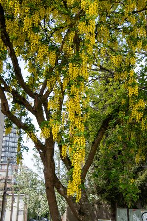 The golden chain or golden rain tree (common laburnum) flowering with the long racemes of densely packed yellow flowers in the park