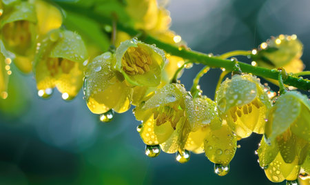 Close-up of dew-covered laburnum flowers in the early morning