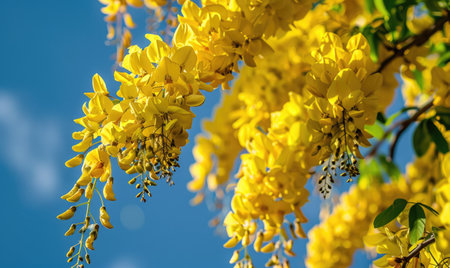 Laburnum flowers with their vibrant color contrasting against a blue sky