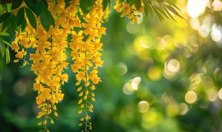A stunning display of sunlit yellow flowers hanging gracefully against a shimmering bokeh background, capturing the essence of nature