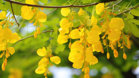 Captivating image of vibrant yellow flowers cascading from a tree, creating a serene atmosphere. The soft sunlight filters through the lush green leaves, enhancing the beauty of nature. Ideal for themes of tranquility and the beauty of the outdoors.