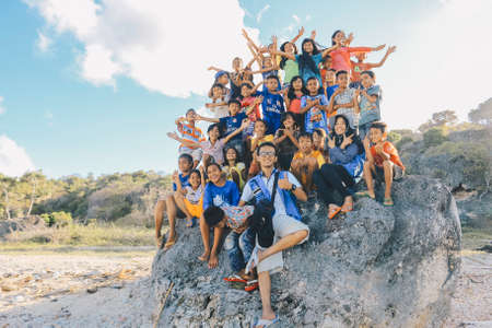 East Nusa Tenggara Indonesia Kids are cheering together enjoy playing in the big rock on the beach. NTT ROTE, INDONESIA - April, 2020.