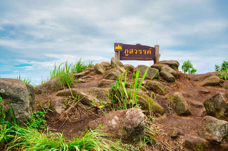 Pusawan signpost on the top of Pusawan mountain at Maewong National Park, Thailand: TEXT TRANSLATION: PUSAWAN mean sea level 1,427 meters