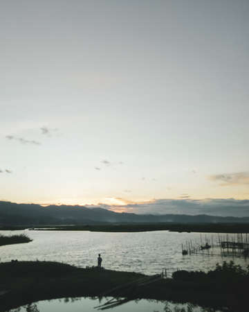 Beautiful view of the ocean and Green Hill on white clouds and blue sky background with the inscription ' I love you ' in Kebumen, Central Java, Indonesia